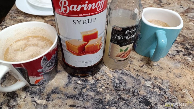 Я люблю сладкие напитки, поэтому экспериментировал с сиропами. Миндальный не понравился, а вот карамельный оказался очень даже ничего.