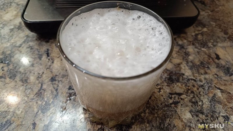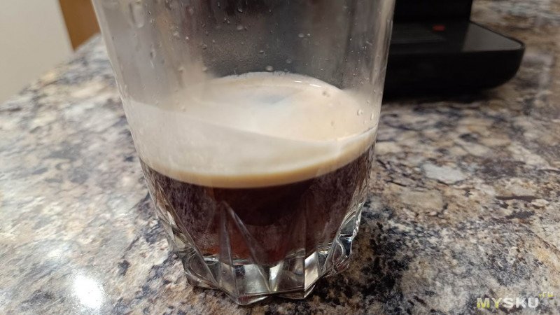Так и есть, объём сваренного напитка составил около 100 мл. Здесь пенка получилась чуть погуще и поплотнее.