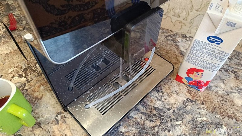 Машина может и сама промывать блок капучинатора, такой режим есть в меню очистки. Для этого вставляем трубочку забора молока в специальное отверстие в поддоне и активируем режим очистки. Он прогоняет горячей водой и паром все узлы капучинатора.