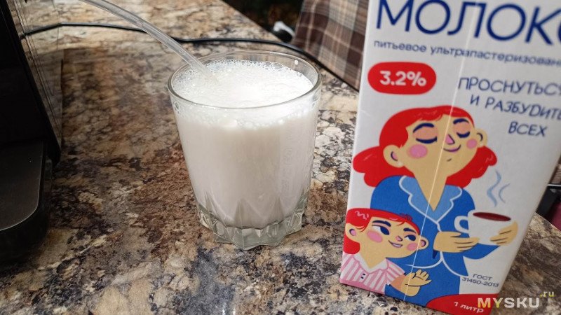 Второй конец опускаем в бокал с молоком, либо напрямую в молочный пакет. Второй вариант менее удобен, так как не видно уровень молока внутри, а трубочка не доходит до дна литрового пакета.