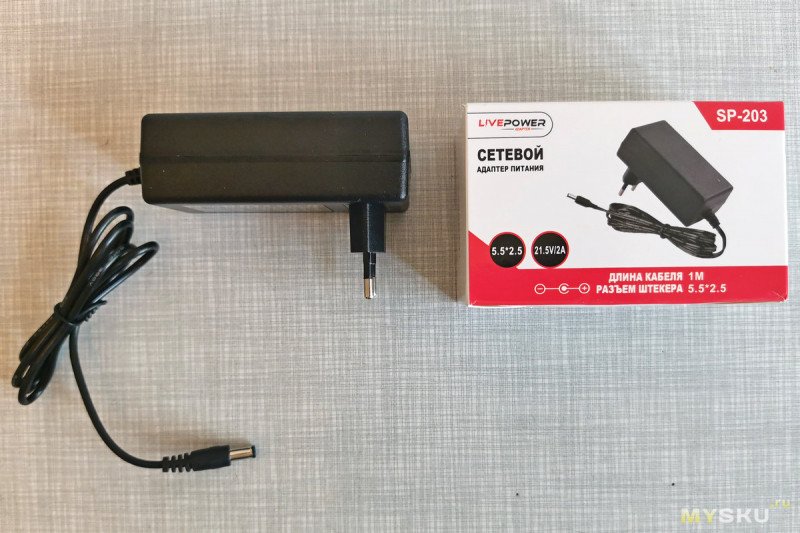 На коробке написано «сетевой адаптер питания 21.5v/2A», но на самом деле это именно зарядное устройство с обеспечением режима заряда CC-CV и двухцветной индикацией окончания зарядки.