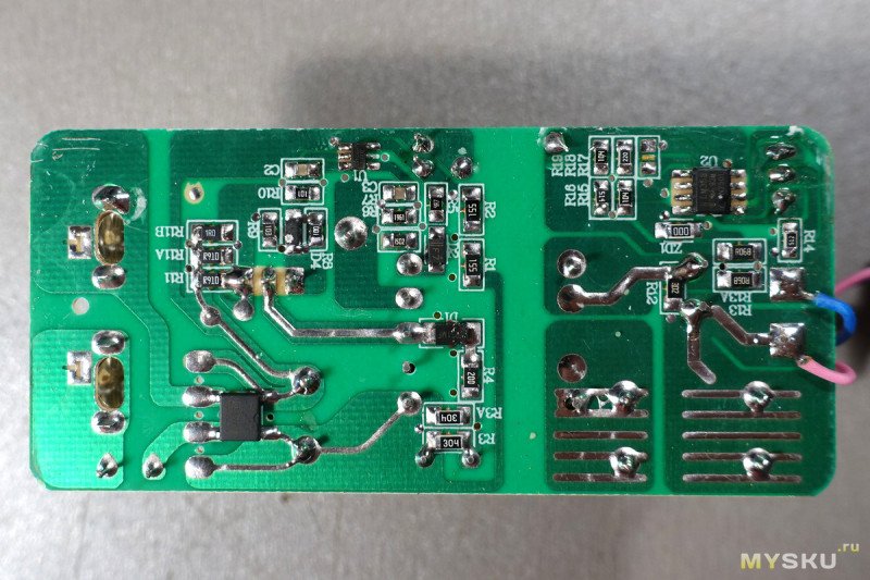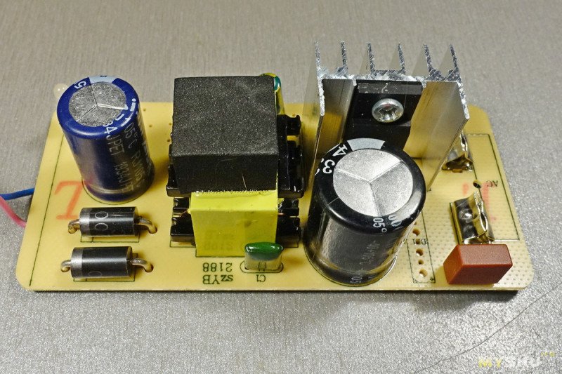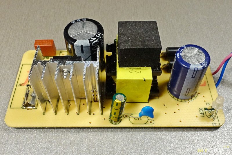 Схемотехника оказалась необычной: вся стабилизация и защита реализована в высококовольтной части, которая не имеет обратной связи с низковольтной. Вся низковольтная часть состоит из двух больших диодов, включённых параллельно, и конденсатора. Плюс схема индикации с компаратором, шунтом и двухцветным светодиодом.