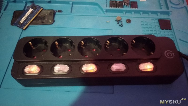 Но есть ещё несколько разных паяльников, горячий оловоотсос, сверлильный станок… это только то, что не имеет собственных выключателей.