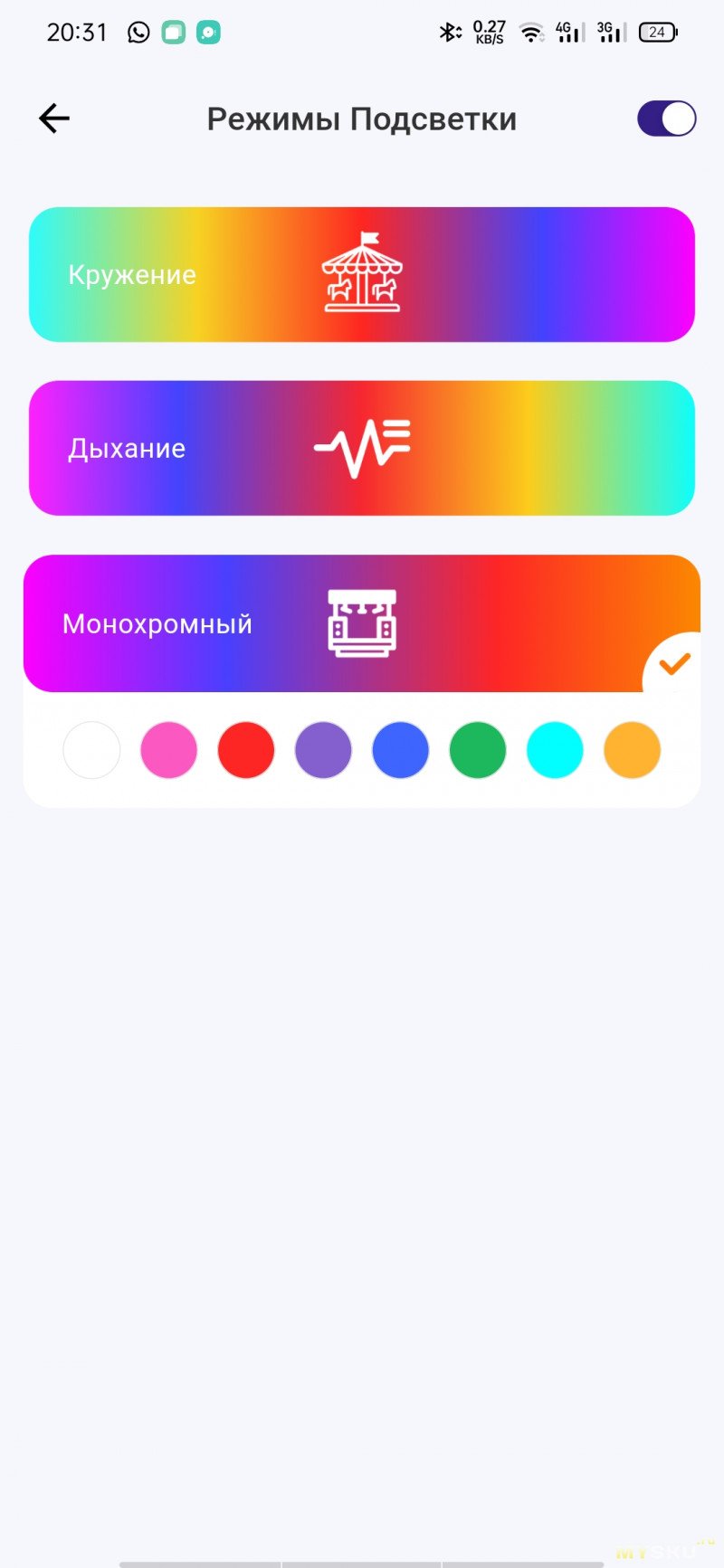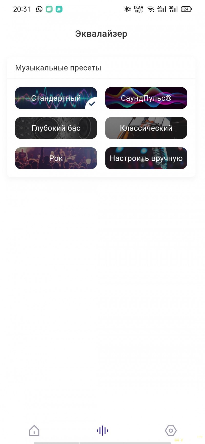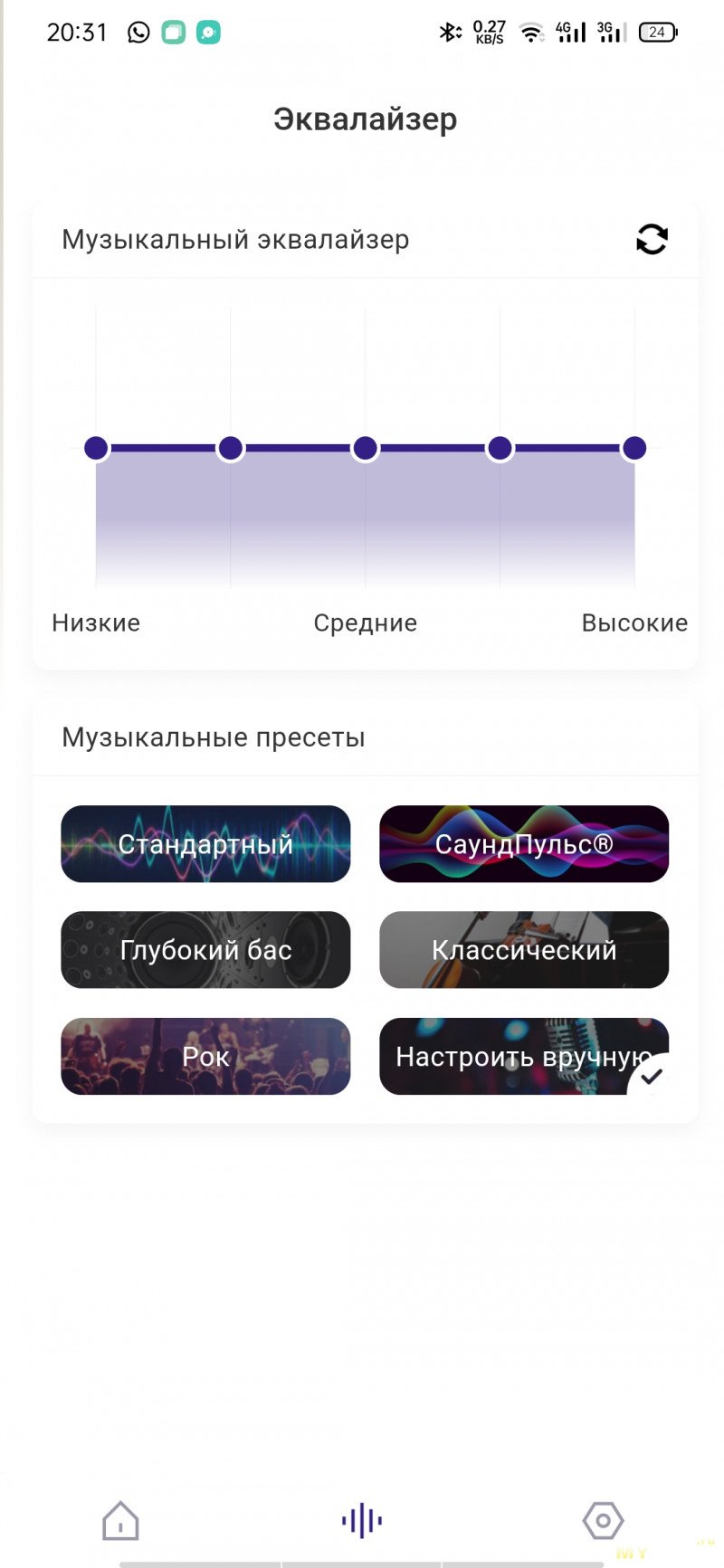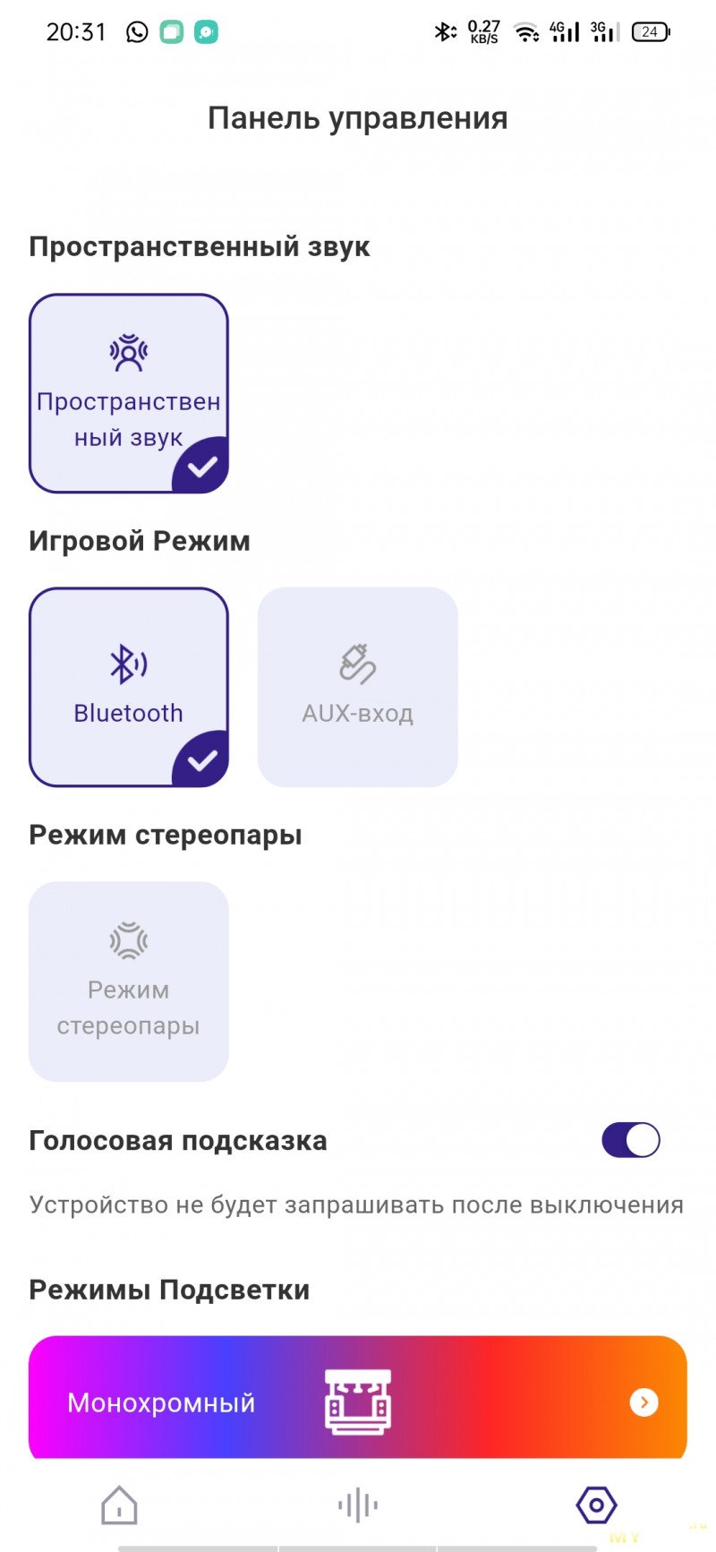 Через приложение можно посмотреть уровень оставшегося заряда, включить/выключить режим пространственного аудио, TWS-режим при наличии второй такой же колонки, переключить источники, сменить пресеты эквалайзера + отрегулировать самостоятельно по 5 полосам частот, переключить сценарии подсветки (всего 3), настроить автовыключение колонки по таймеру, обновить прошивку. «Фирмовый» режим SoundPulse здесь также имеется.