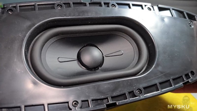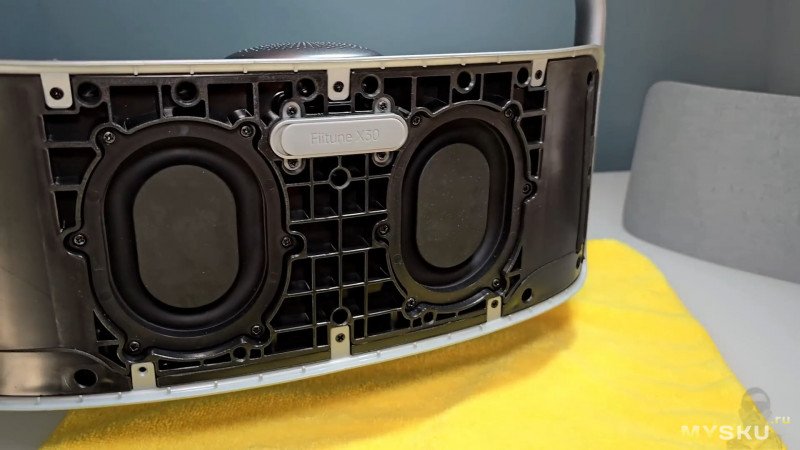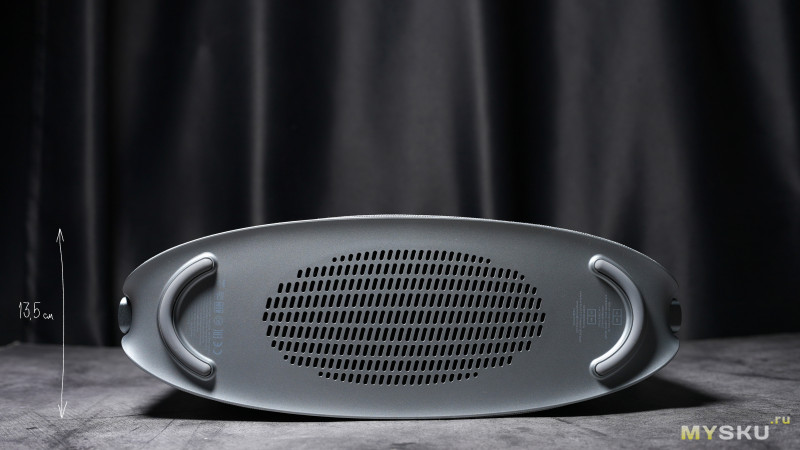 Опирается колонка на довольно массивные силиконовые дугообразные ножки. Массивная перфорация на дне скрывает низкочастотный динамик (в придачу к четырём пассивным излучателям). Можно ещё заметить, что колонка относительно тонкая — всего 13.5см в ширину в средней чести.