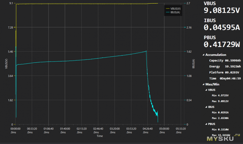 Для зарядки колонки используется вполне современный протокол PD3.0 с мощностью, ограниченной 15.5 Вт (9В, до 1.62А). В начале в моменте колонка эпизодически подхватывает 5В при 2.65А. Полное время заряда 4ч 46мин.