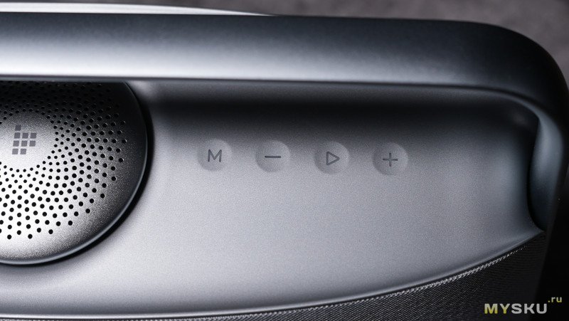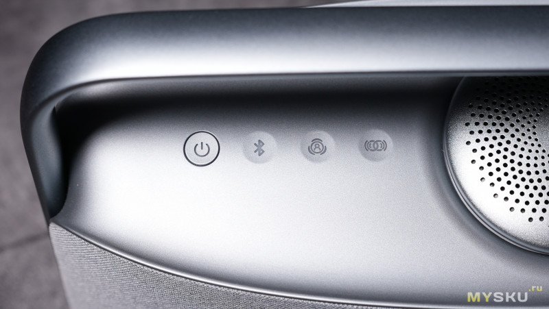 Слева с края находится физическая кнопка включения/выключения устройства, далее сенсорные клавиши — сброс Bluetooth, вкл./выкл. эффект пространственного звучания, режим TWS при наличии «брата-близнеца» этой колонки.