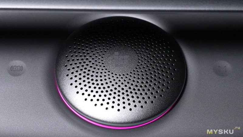 Углубление под окружностью верхнего динамика во время работы колонки оснащено RGB-подсветкой. Через мобильное приложение можно настроить три сценария анимации, либо выключить подсветку.