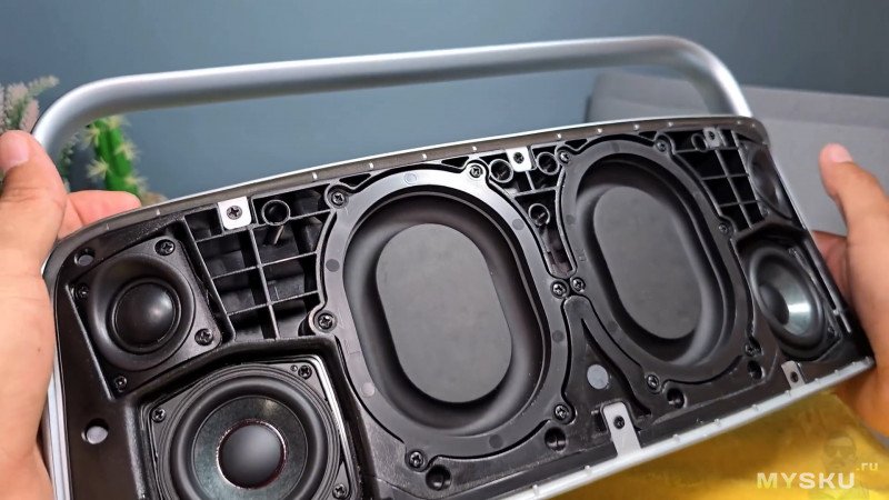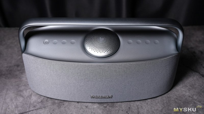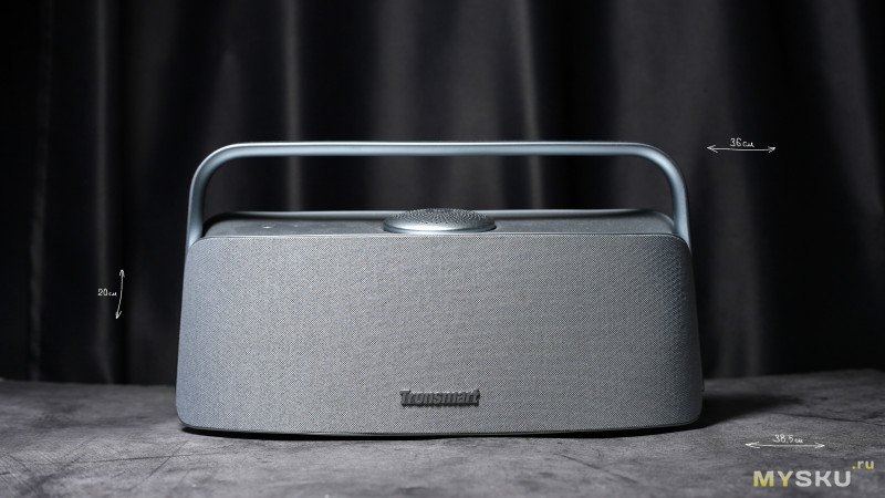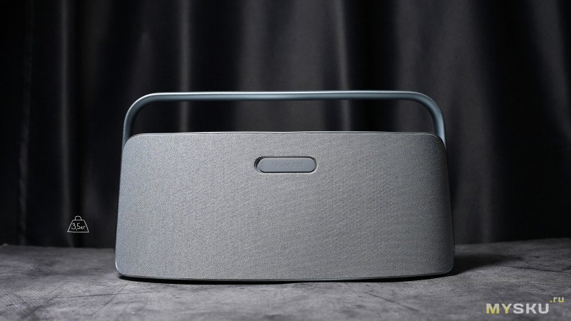 Лицевая сторона закрыта тканевой обивкой, внизу лого бренда. В колонке используется суммарно 6 динамиков суммарной мощностью 80Вт. С фронтальной стороны находятся два пассивных излучателя + два среднечастотных динамика + два твиттера. Силуэт колонки имеет слегка трапецевидную форму с широким основанием 38.5см и немного более узкий верхом по линии рукоятки — 36см. Высота устройства 20см.