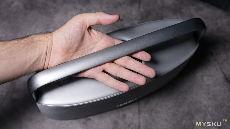 С левого и правого торца корпус колонки огибает металлическая ручка. При этом корпус устройства сделан из пластика, покрашенного в серебристый. Также можно заметить, что верх корпуса колонки не ровный, а слегка наклонён вниз.
