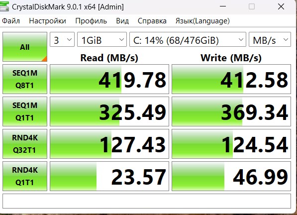 SSD в режиме чтение-запись выдает чуть более 400 MB/S.