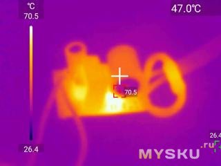Нагрев светодиодов приятно удивил, несмотря на отсутствующий теплоотвод, диодов — много, площадь — большая, и нагрев оказался весьма умеренный, рассеивать 0.2Вт с корпуса при такой конструкции не проблема. Тут правда стоит отметить, что температура окружающей среды градусов 10, а не комнатные 25, но даже если накинуть 15 градусов, все равно 70 на диодах это значительно лучше большинства цокольных ламп, по площади нагретых участков видно, как неравномерно приклеена лента: