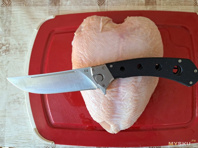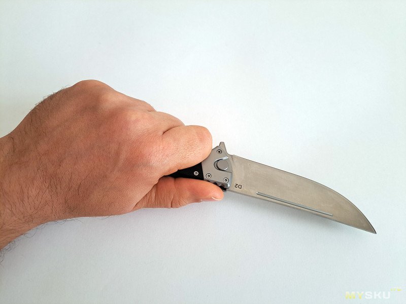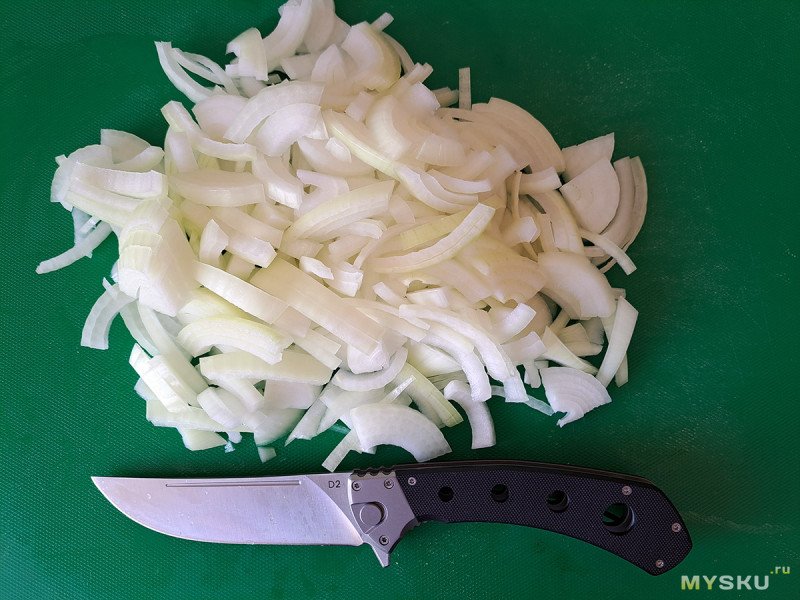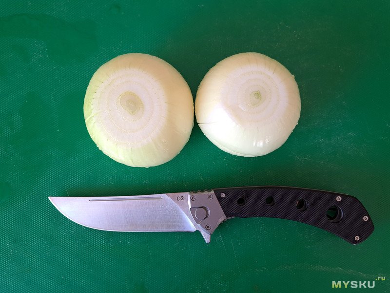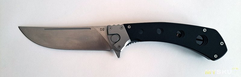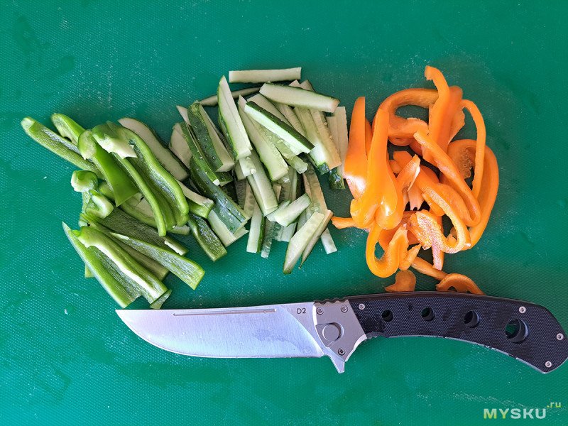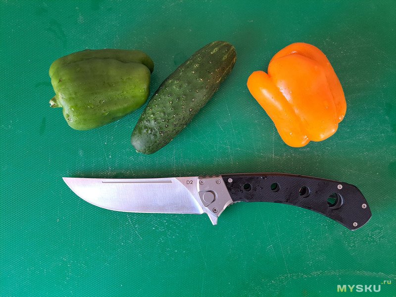 Мне очень понравился этот большой складной нож по соотношению цена/качество. Но, к сожалению, с настоящим кухонным пчаком он не сравнится, так как нет сведения в ноль. С другой стороны, мало кому действительно необходимы складные кухонные ножи. Так что, если интересен складень с клинком из стали D2 необычного дизайна, добро пожаловать в обзор.