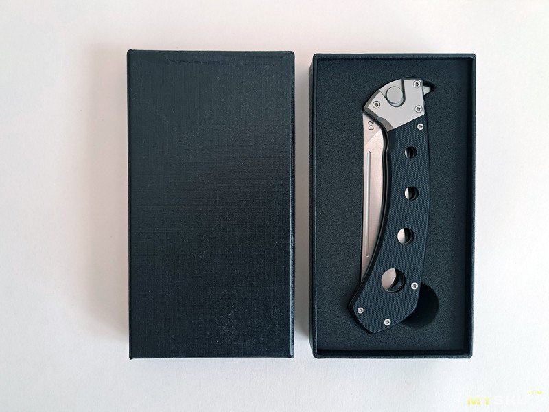 Нож упакован в такую же черную коробку, как у недавней Финки С. Только, конечно, ниша для ножа сделана индивидуально.