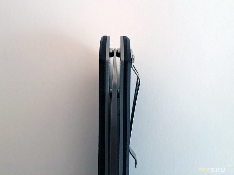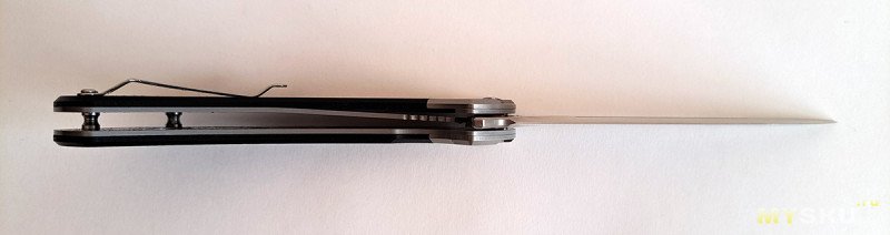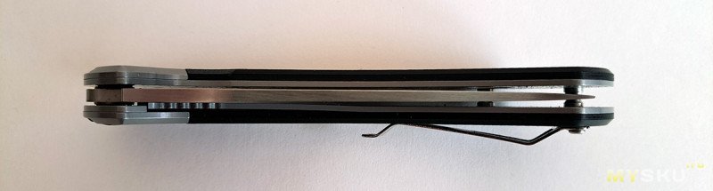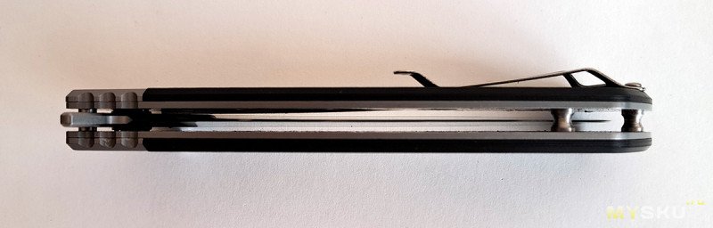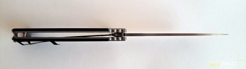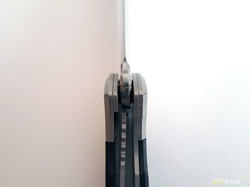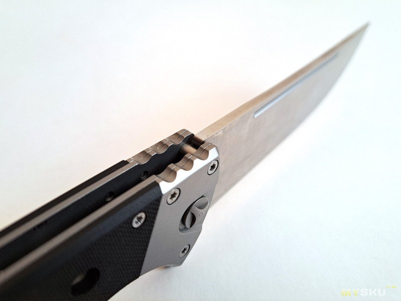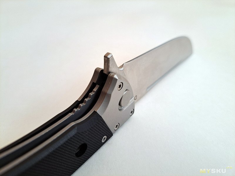 Клинок на подшипниках, видно с этого ракурса. Фиксируется замком типа лайнер-лок. Пластина замка на начале пяты, все отлично.