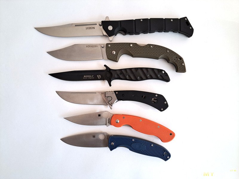 Подделки Luzon и Voyager Xl от Cold Steel, подделка Финка С от Нокс, складной пчак, подделки Spyderco Military и Resilience.