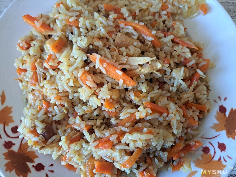 Рассыпчатый, вкусный плов готов. Пора угощать родственников.