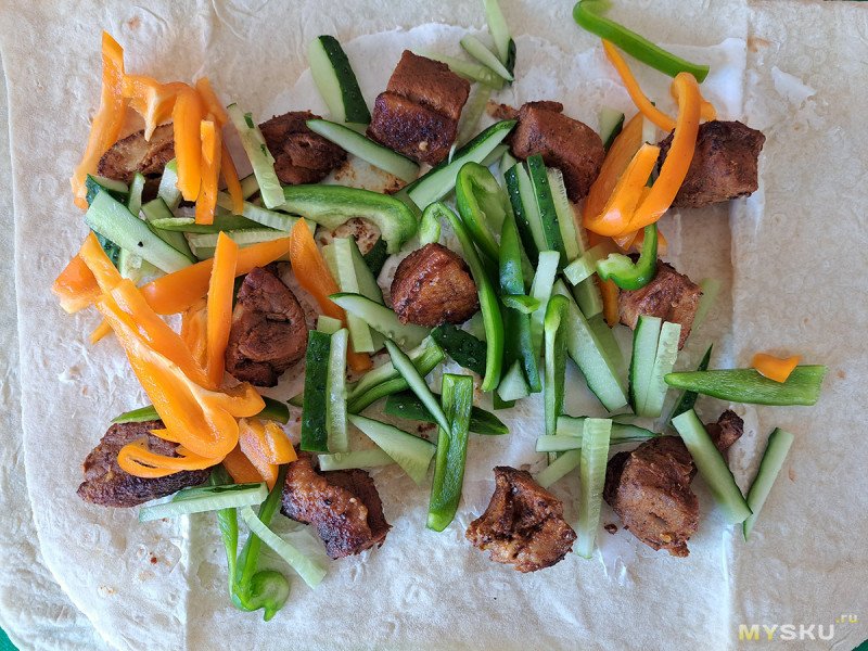 Тут бы или обжарить овощи, или хотя бы намазать лаваш соусом, но шашлык жирный и вкусный, поэтому делаем рулет и едим просто так. Норма белков, жиров и углеводов на завтрак получена.
