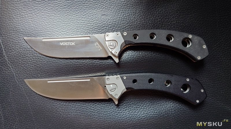 От оригинала отличается меньшей толщиной клинка (3.2 против 3.8; общей толщиной по плашкам (14.2 против 16.0) и меньшим весом (не взвешивал), обозреваемый нож показался мне более удобным в использовании.