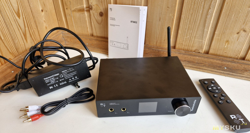 Сетевой импульсный блок питания (на нагрузку выдает 100 Вт без существенной просадки питающего напряжения DC 24 В), пульт ДУ, кабель с «тюльпанами» для линейного входа и руководство на русском языке.