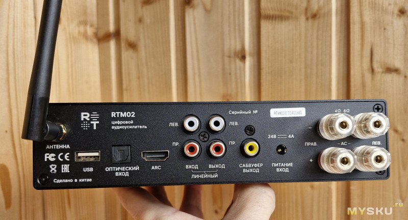 Корпус усилителя алюминиевый (есть резиновые ножки снизу), основные интерфейсы сзади: