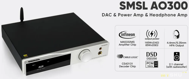 Выходы: на колонки, аналоговый RCA, на активный сабвуфер