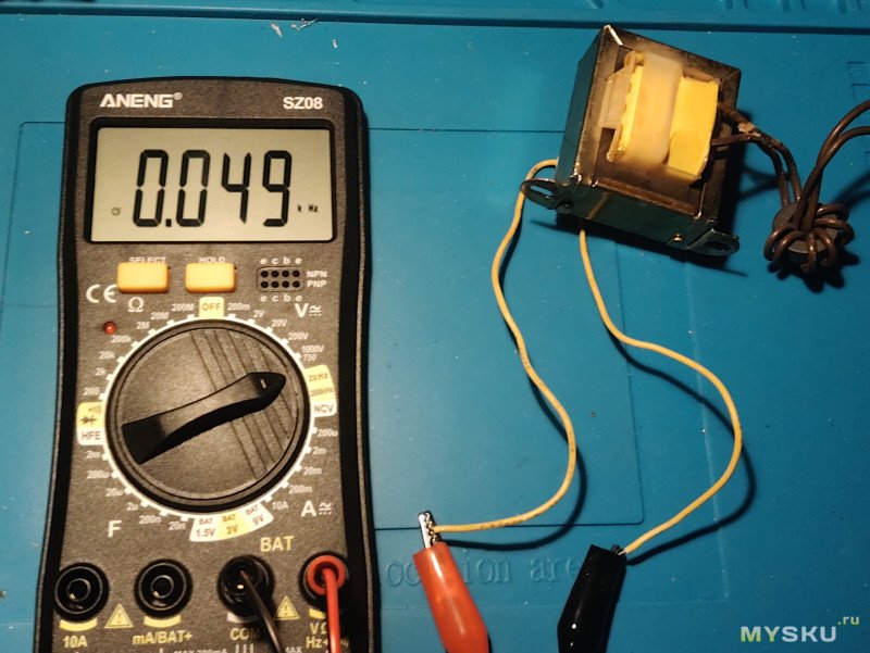 Тест провален — выставил 10А, щупы поставил в нужные гнёзда. Прикоснулся к выводам из гнезда 220V — щелчок и дымок сизый изнутри мультиметра. Разобрал — видимых повреждений нет, собрал и продолжил тесты (мультиметр не «сгорел»). Ну хоть частоту померял: