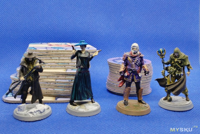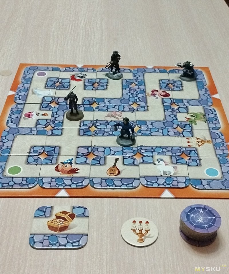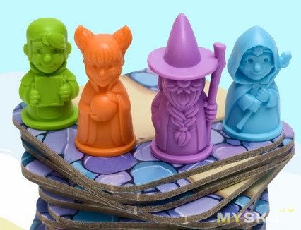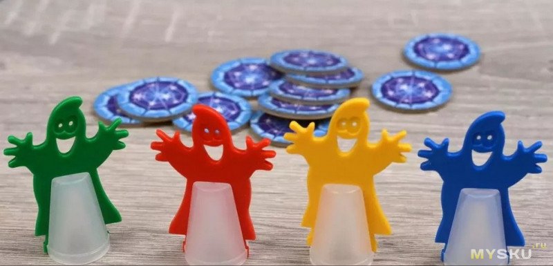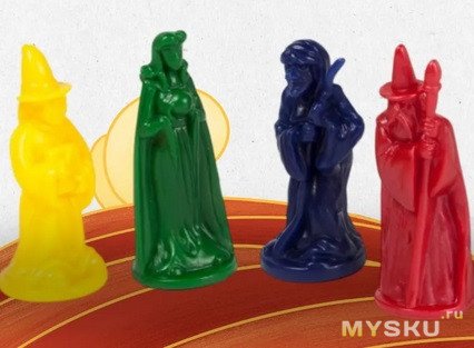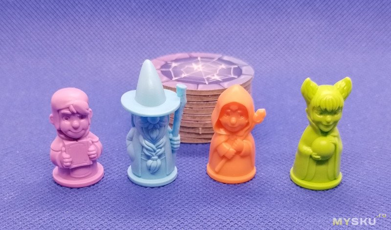 4 пластиковых волшебника у которых на карте есть исходное место в соответствии с их цветом.