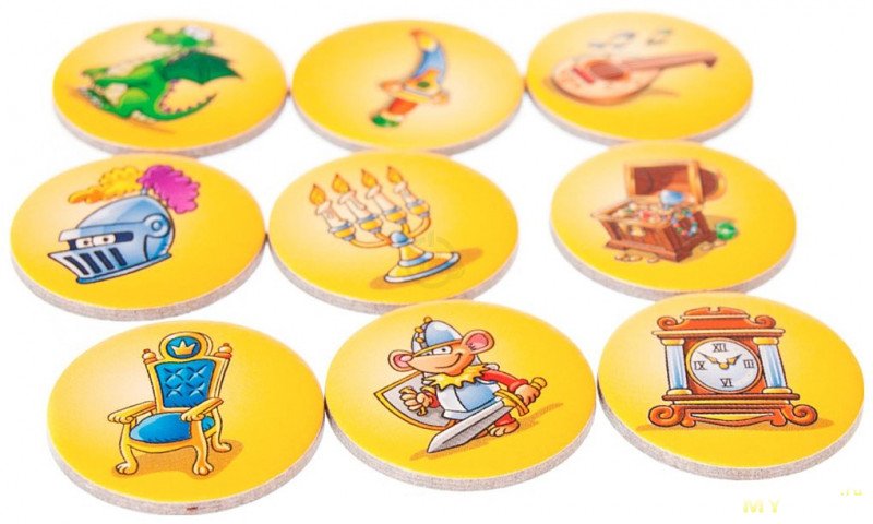 12 круглых фишек с изображением предметов к которым нужно добраться в постоянно меняющемся лабиринте