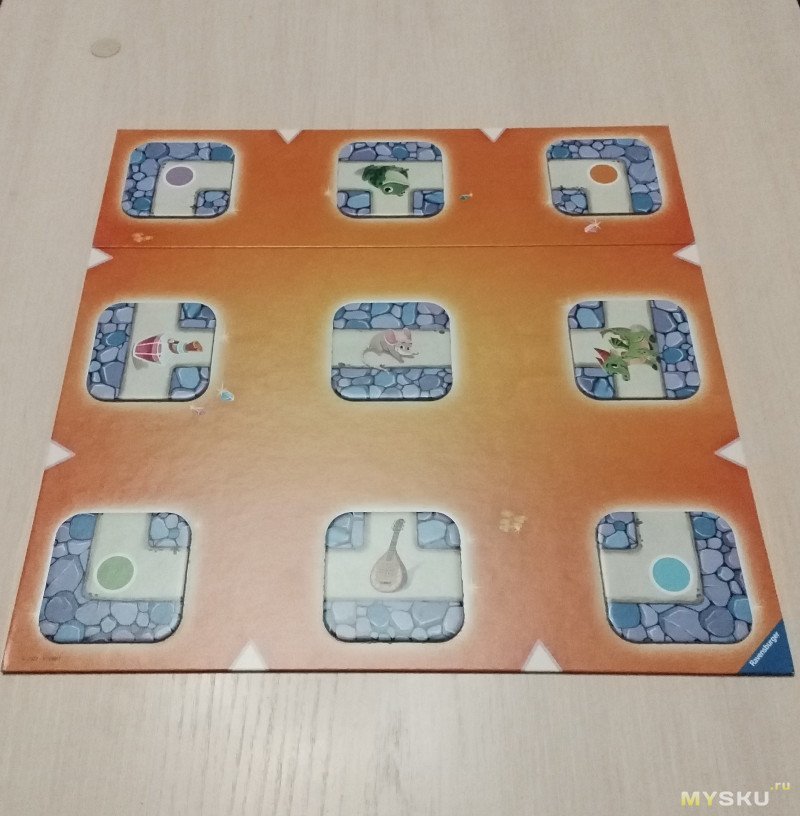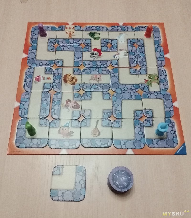 17 плиток тайлов с изображением ходов. На игровом поле уже есть фиксированные плитки, которые нельзя сдвинуть. Их 9, находятся по периметру игрового поля. Остальные тайлы 16 с изображением ходов и объектов нужно выложить на игровом поле
