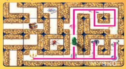 Игрок, сдвинув лабиринт крайней плиткой может ходить по лабиринту собирая на поле предметы, изображенные в задании. Естественно двигаться можно по дорогам, которые не прерываются и приводят к изображенным на плитках предметам. Количество шагов не играет никакой роли