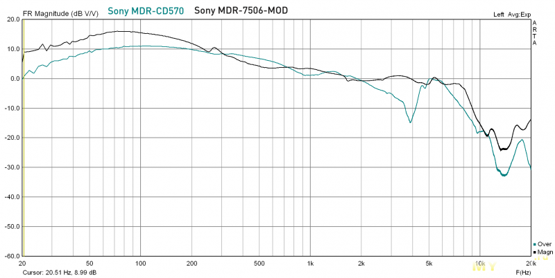 Еще раз сделал сравнительные измерения АЧХ наушников MDR-CD570 и теперь уже модифицированных MDR-7506-MOD.