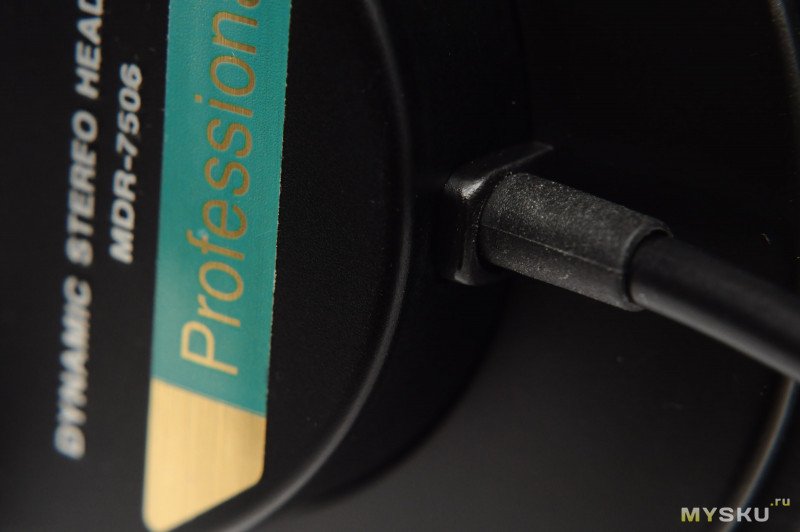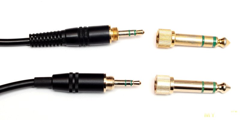 Шнур имеет стандартный разъем диаметром 3.5 мм. Через переходник он может включаться в разъем диаметром 6.3 мм. На фото показаны разъемы и переходники настоящих Sony MDR-CD570 (сверху) и этих MDR-7506 (снизу). В целом они очень похожи. Золото на старом разъеме более желтого цвета, а не белого, как на новом.
