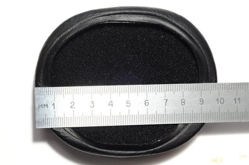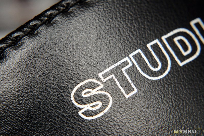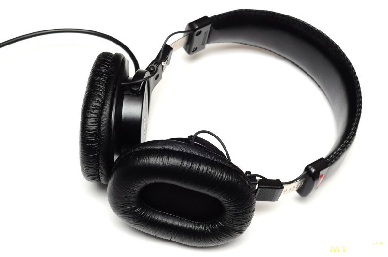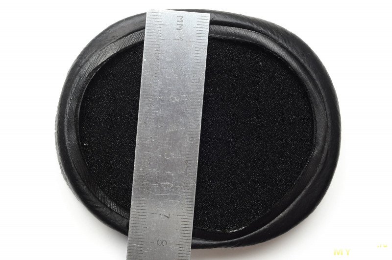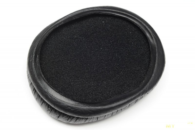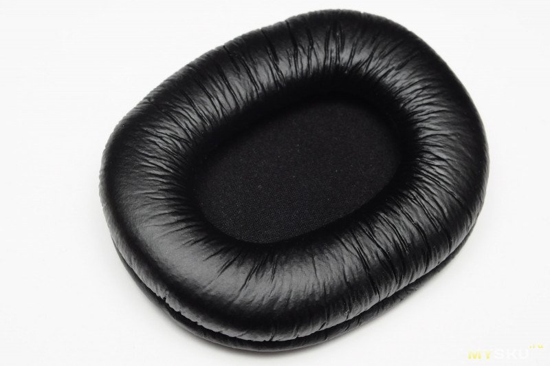 На чашки надеты амбушюры, они здесь овальной формы, достаточного размера, чтобы в них помещались уши. Внутри амбушюр, вероятно, поролон. Снаружи – тонкая виниловая искусственная кожа. Фактически, это ткань, сверху покрытая тонким слоем ПВХ-пленки. Довольно непрочный материал, через короткое время пленка начинает осыпаться. К счастью, для этих наушников амбушюры можно купить отдельно, хоть велюровые, хоть из натуральной кожи.