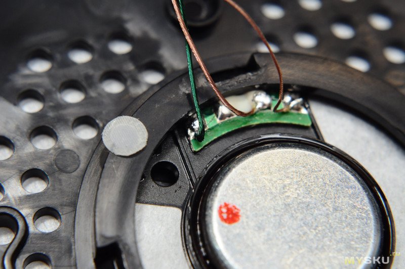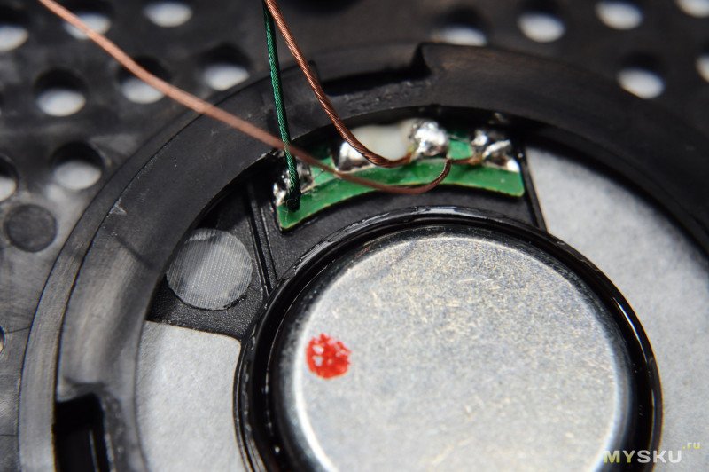 Такое отверстие есть во многих драйверах, но оно обычно открытое. Открыть его – самое простое, что можно в данном случае сделать. Обычно манипуляции с bass port дают незначительные изменения в звучании. В данной ситуации хватило бы лишь немного добавить басов, и тогда наушниками можно было бы пользоваться. Под наклейкой оказалось сквозное отверстие диаметром примерно 3.5 мм. Оставил открытым и собрал наушники.