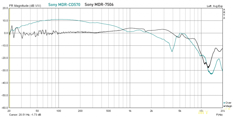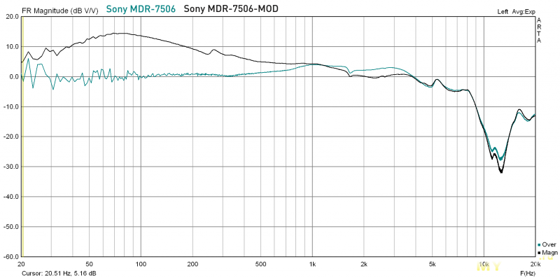 Ситуация стала обратной, теперь MDR-7506-MOD выигрывают по басам более чем на 6 дБ, а в остальном характеристика осталась довольно ровной. В отличие от MDR-CD570, нет неприятного провала вблизи 4 кГц.