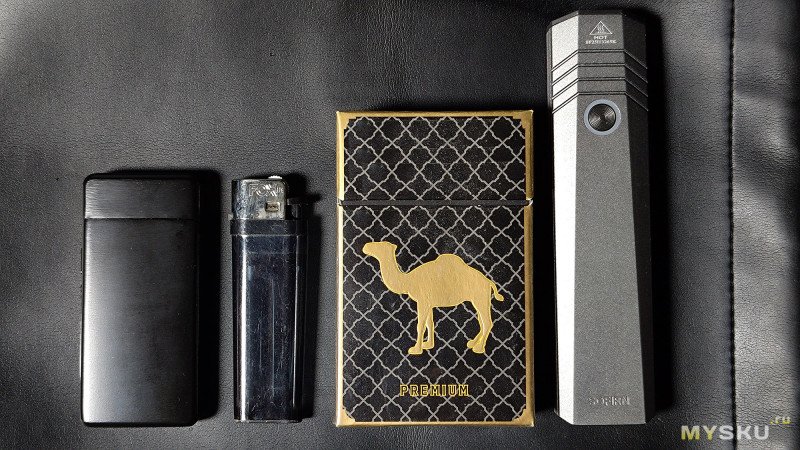 В отличие от обычной газовой зажигалки, перекрёстная дуга не сдувается. Ниже внешнее сравнение размеров с обычной зажигалкой и коробочкой известного размера и с силуэтом знаменитого животного.