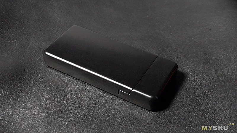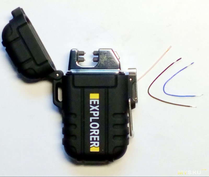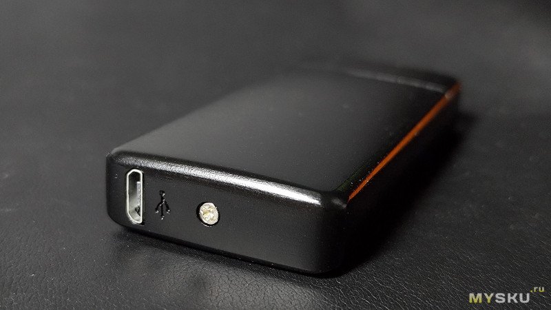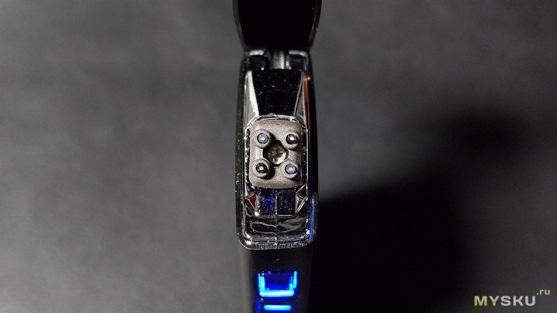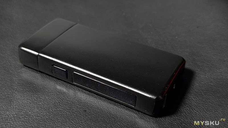 На нижнем торце корпуса находится уже устаревший microUSB разъём для зарядки встроенного аккумулятора и винт для разборки. Символ USB-соединения как будто намекает, что зажигалку можно прошить. По отзывам полного заряда зажигалки на три дня, если каждый день высаживать по одной пачке.