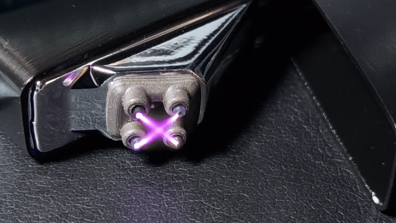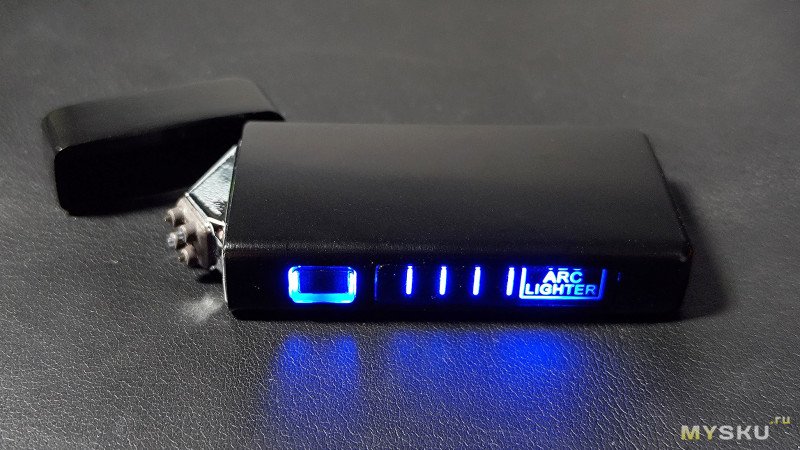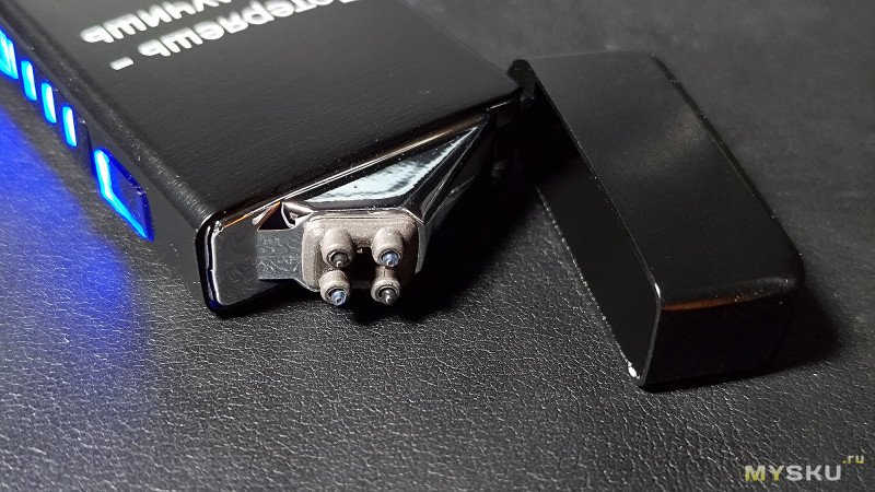 Так как если открыть зажигалку, эта сторона будет постоянно светиться синей подсветкой. Четыре сегмента — по идее уровень заряда у встроенного аккумулятора, но судя по отзывам, эти сегменты светятся всегда и никак не меняются. Правее статичная надпись ARC Lighter