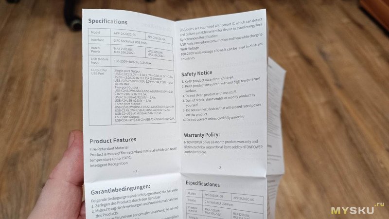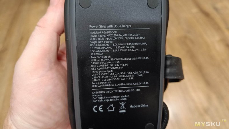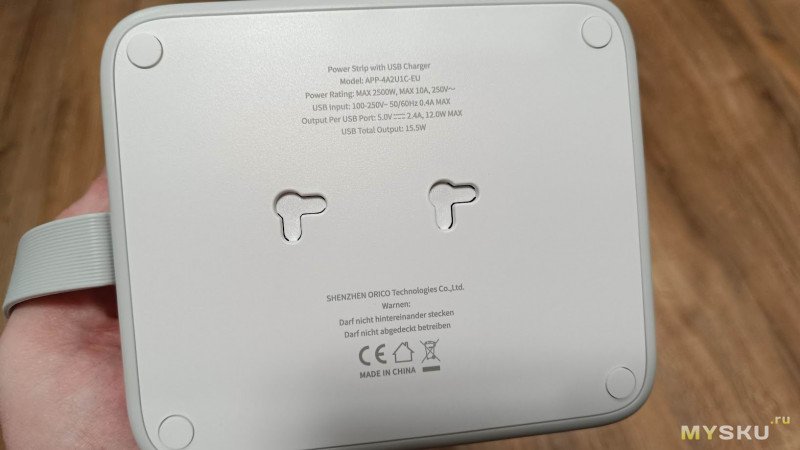 На обратных сторонах корпусов указаны электрические параметры силового блока розеток, а также подробно расписаны выходные параметры портов USB/Type-C в различных комбинациях использования выходов. У 4-х розеточного здесь также расположены двунаправленные проушины под штатные саморезы.