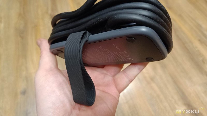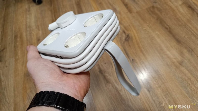 Оба удлинителя имеют оригинальный способ хранения кабеля — его нужно намотать на бортики по направлению, указанному стрелкой, перехватить резинкой и вставить вилку в одну из розеток.