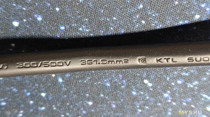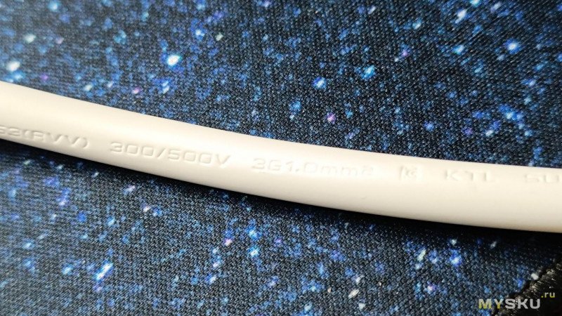 В характеристиках заявлен 3-х жильный кабель с сечением 1,5 мм², однако на обоих удлинителях маркировка свидетельствует о жилах с сечением 1,0 мм². Но в любом случае этого достаточно для пропуска заявленной мощности в 2500 Вт с током 10 А. В соответствии с нормативами, длительно допустимая токовая нагрузка на одну жилу в таком кабеле составляет 14 А.