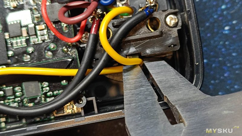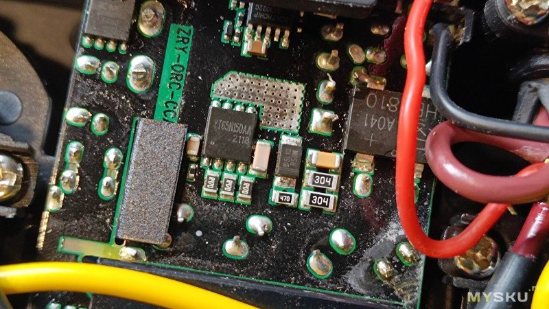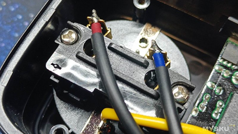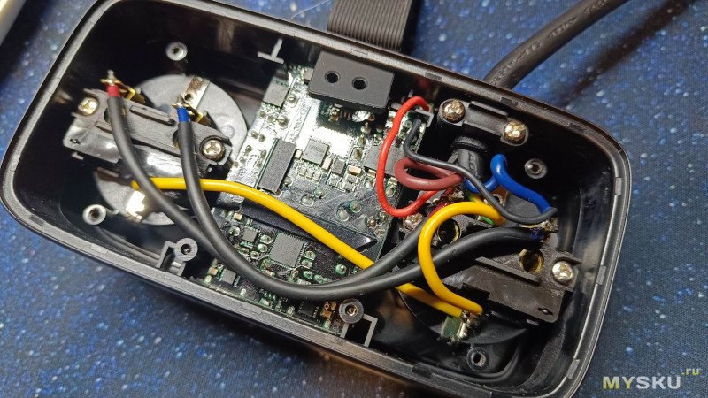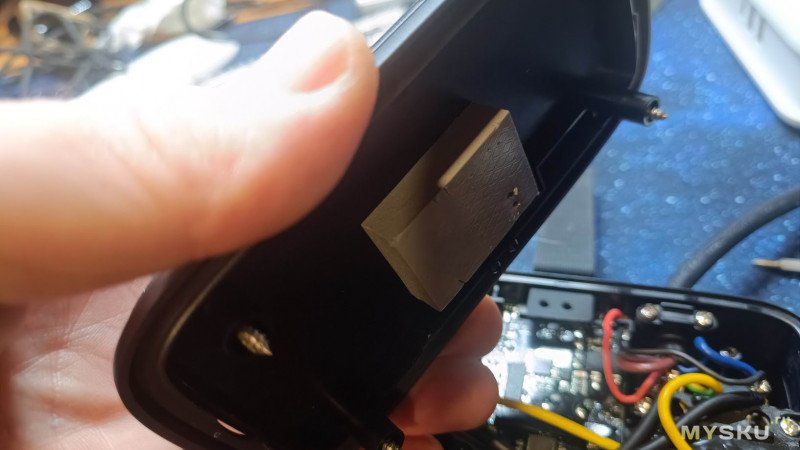 Внутри 2-х розеточного конструкция другая, первое отличие в толстой термопрокладке с другой стороны корпуса, которая призвана служить отводом тепла для мощного зарядного устройства.
