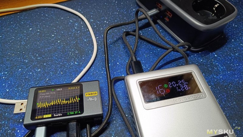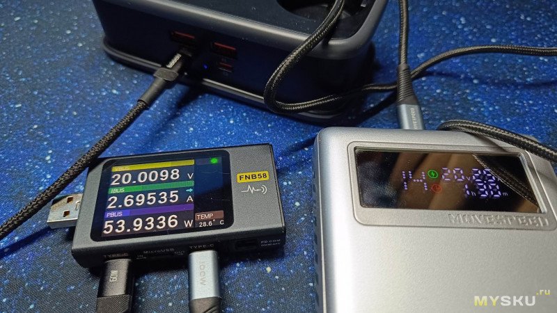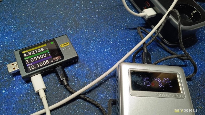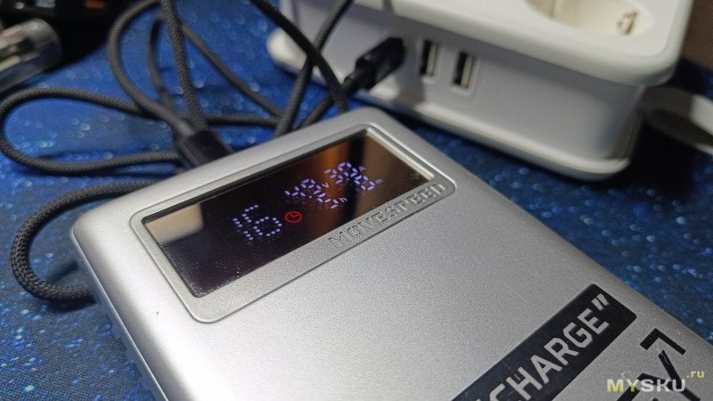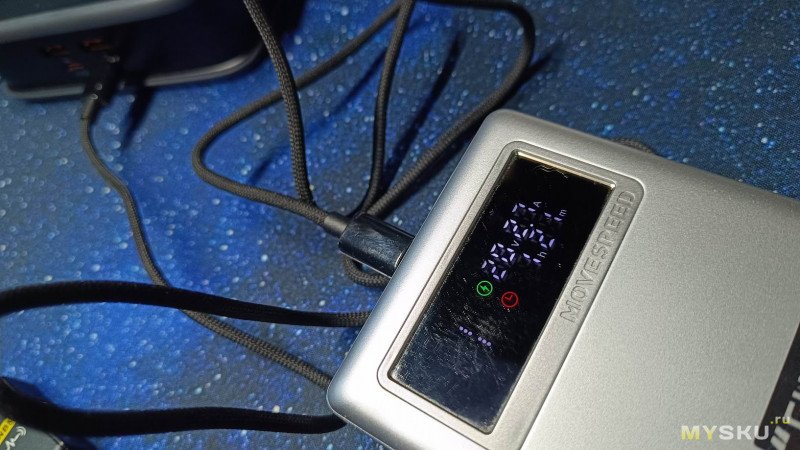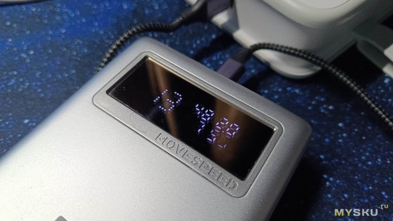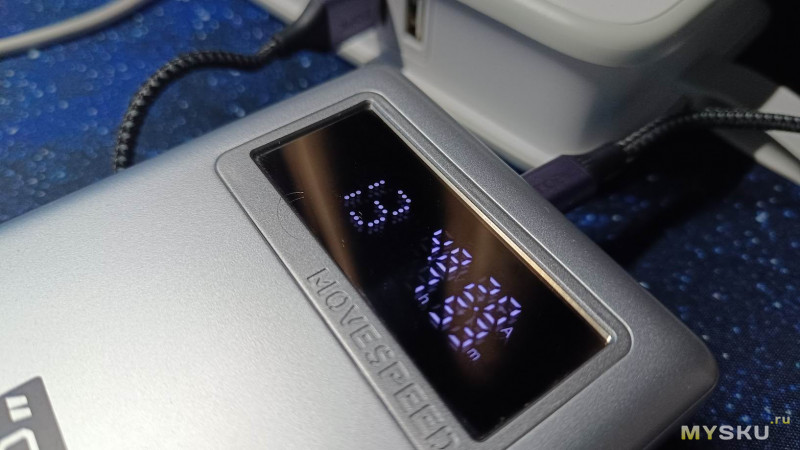 Проверим тогда его реальной нагрузкой — повербанком MOVESPEED M25, имеющим индикацию параметров заряда.