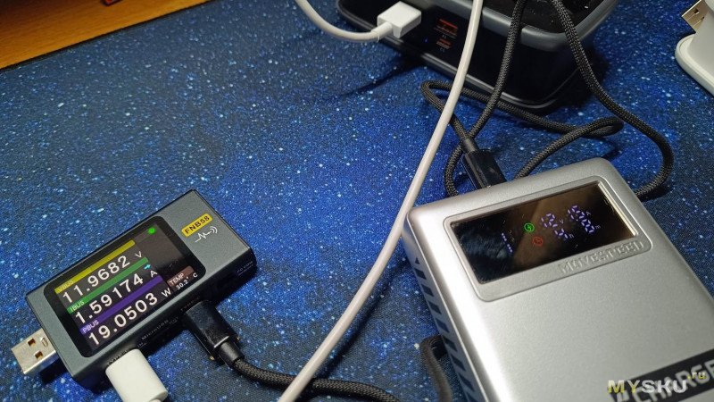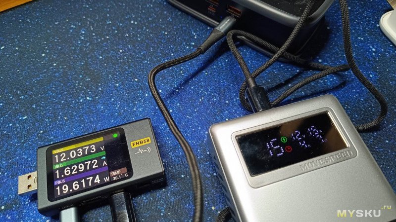 Вновь проверяем под нагрузкой. Левый порт — 19 Вт при 12 В, правый порт — 10 Вт при 5 В.