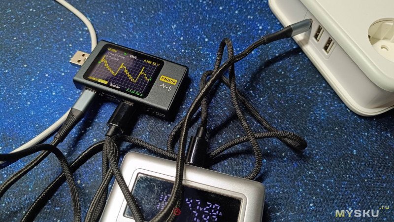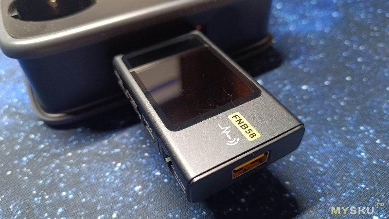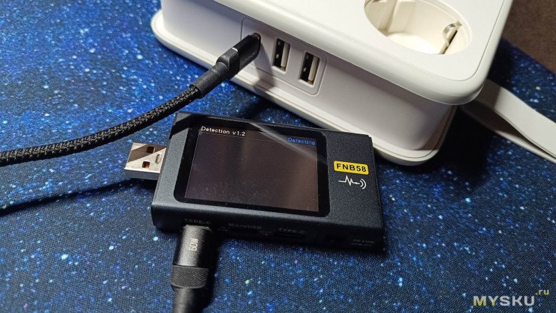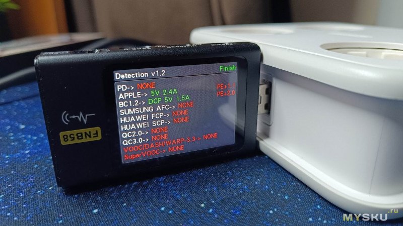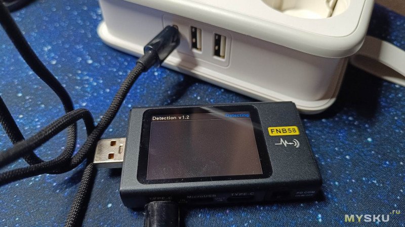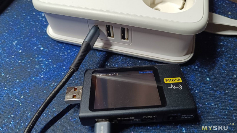 Проверим заявленные возможности зарядных блоков при помощи USB тестера FNIRSI-FNB58. Начнём с 4-х розеточного фильтра и портов USB-A, так как USB тестер можно подключить к ним напрямую без кабелей. Результаты на обоих портах одинаковые.