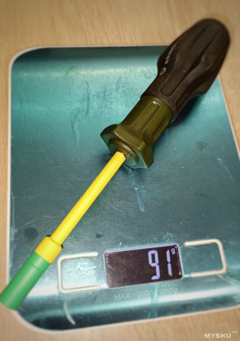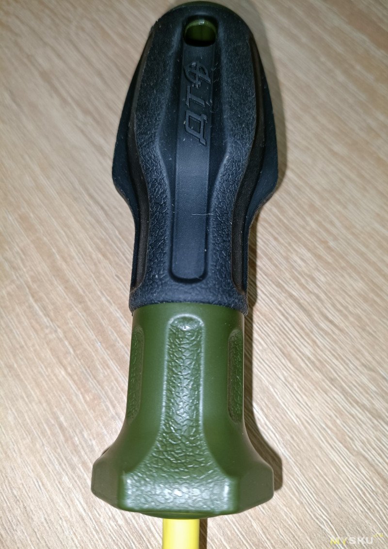 Чёрная часть рукоятки податливый и нескользящий полимер, а зелёная — жёсткий и заметно скользкий. Но в целом держится в руке надёжно и усилие приложить позволяет.