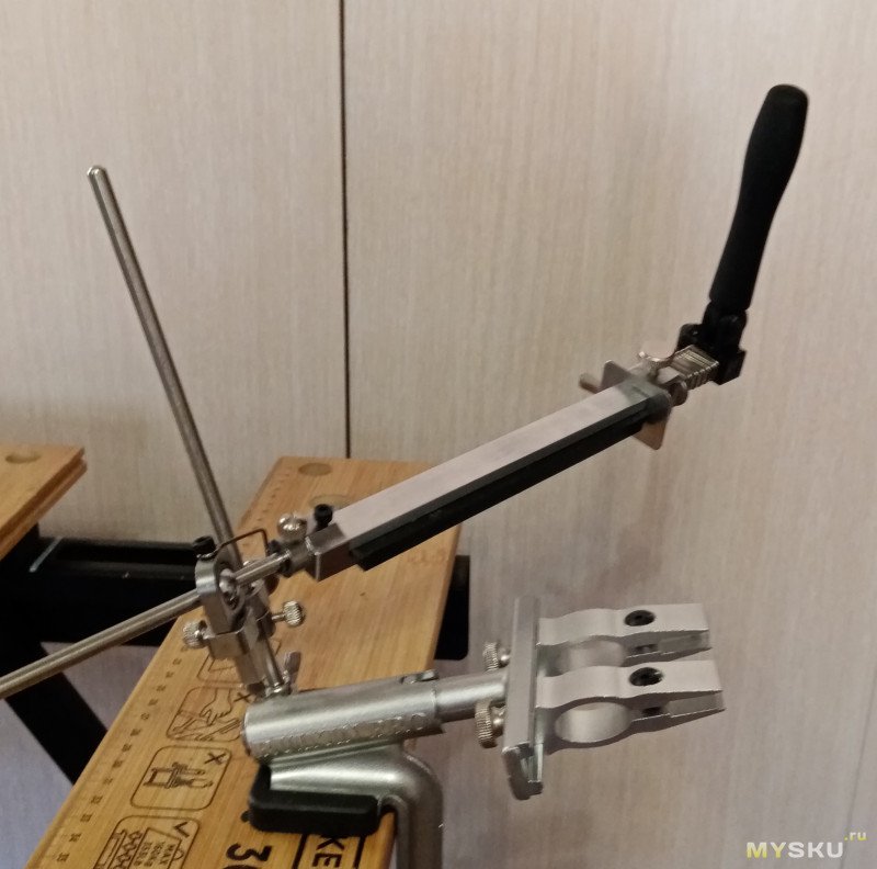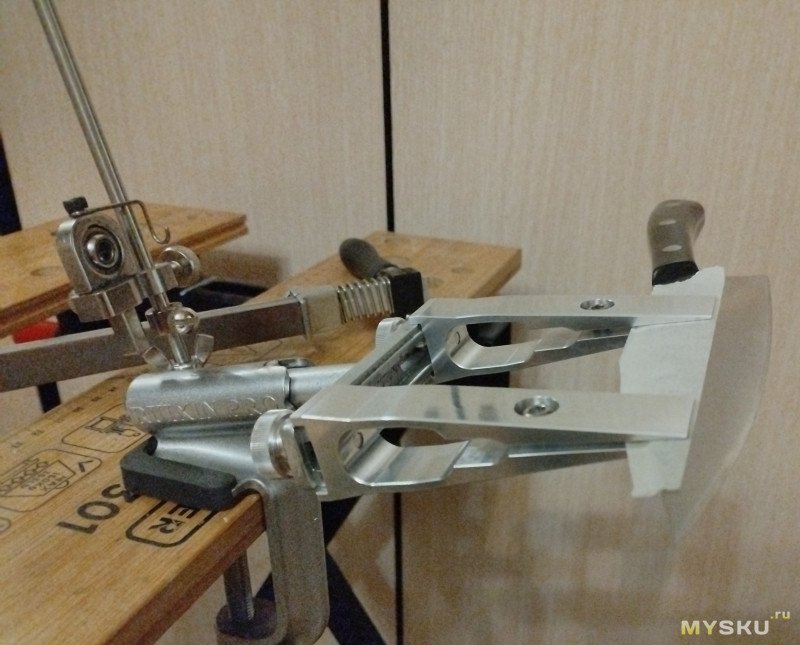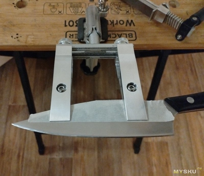 Но вот работать с такими зажимами мне было не комфортно, особенно когда переходил с 15 градусов на строну на еще меньший угол, например, 13-14. Зажимы короткие и вынос клинка небольшой.