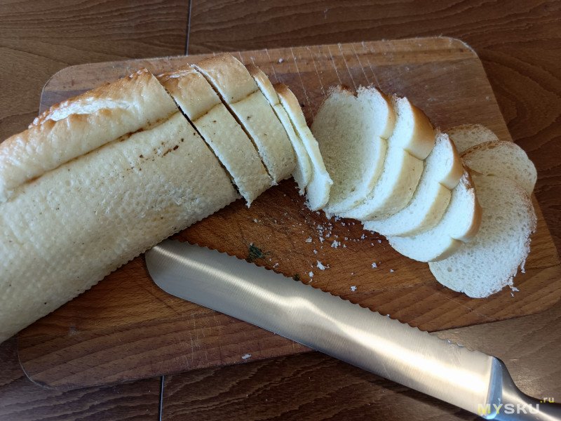 Хлебный нож режет как свежий хлеб или батон, так и уже подсохший. Можно резать как тонко, так и толсто с минимумом крошек.