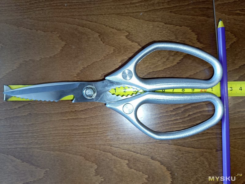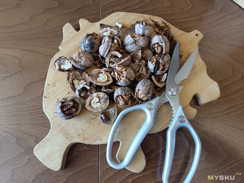 Ножницы кухонные классные. Конструкция неразборная, две половинки соединены винтом с гайкой. Рукоятки алюминиевые и не должны сломаться. Я очень сильно люблю орехи и их ем постоянно, ем с чаем и медом, а также всегда колю их перед походом в баню. Из-за скругленных углов орехоколки и массивных рукояток расколоть орехи не составляет никаких трудов. Это куда лучше, чем стучать молоточком на весь дом и потом убирать разбросанную по всей кухне скорлупу.